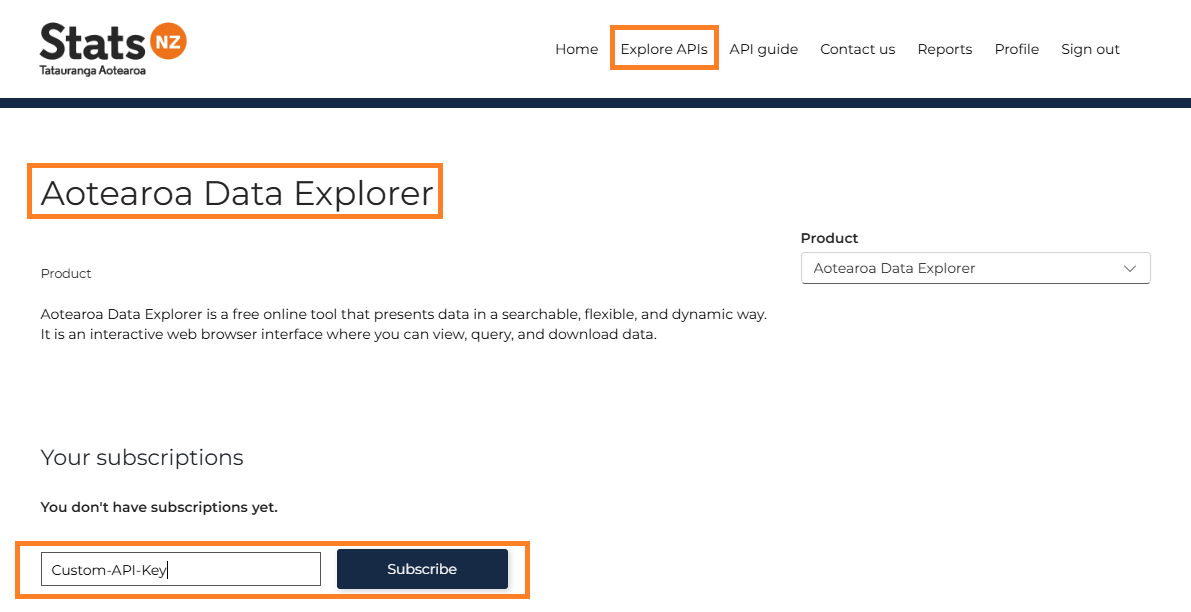 Manage your subscriptions by selecting ‘Profile’ from the menu. From here you can display your subscription key(s) or regenerate a new one. You can also cancel a subscription if you no longer require it.